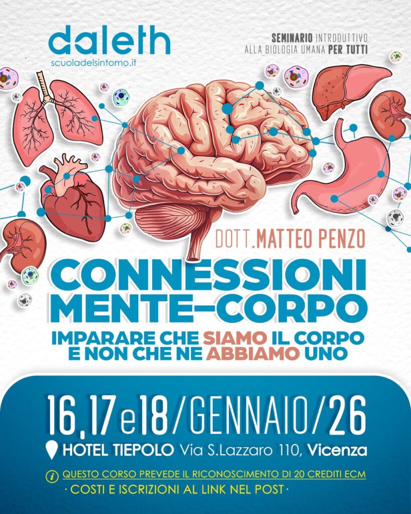 Durante le tre giornate, attraverso spiegazioni chiare, casi reali ed esperienze pratiche, il Dott. Matteo Penzo accompagnerà i partecipanti in un viaggio alla scoperta delle connessioni mente-corpo, delle dinamiche emozionali che attivano i processi biologici e delle modalità con cui possiamo trasformare la consapevolezza in uno strumento di benessere quotidiano.